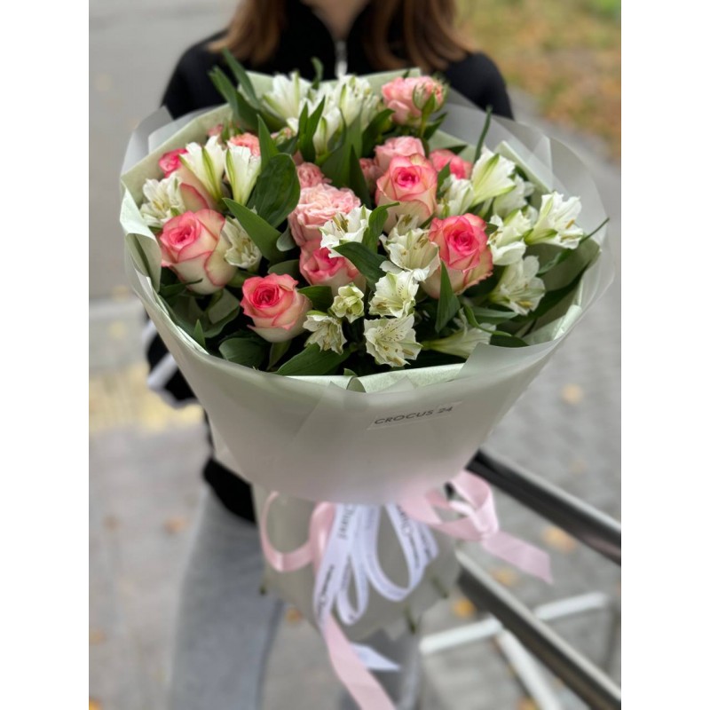 Состав: 8 роз, 1 кустовая роза, 4 альстромерии