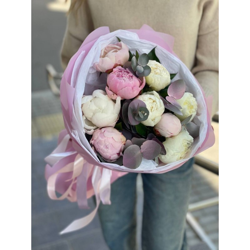 Состав букета: роза 60 см -7шт, кустовая роза -5 шт, упаковка