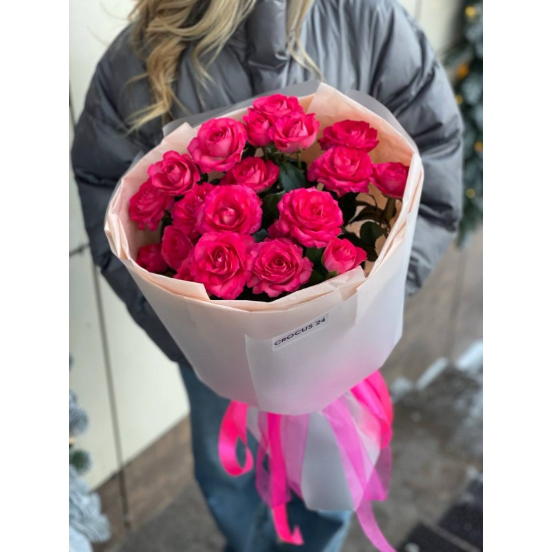 7 эустом, 11 кустовых роз, эвкалипт, упаковка, лента