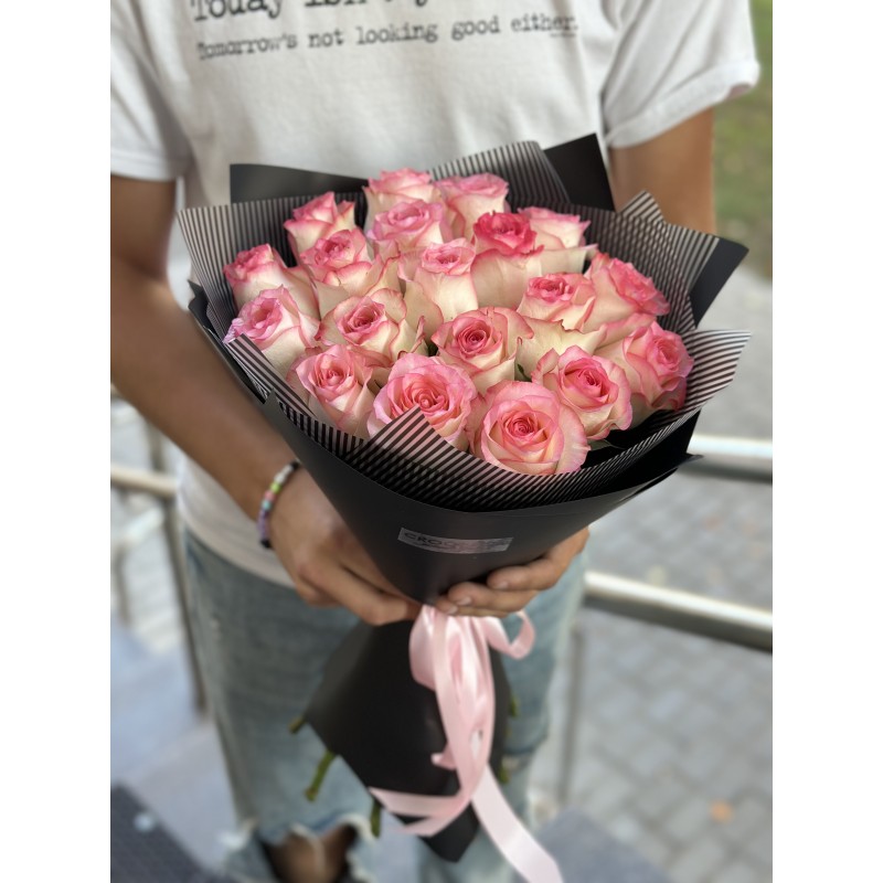 Роза - 3 шт., кустовая Роза - 5шт., эвкалипт, коробка 12см диаметр, 12 см высота, оазис, лента