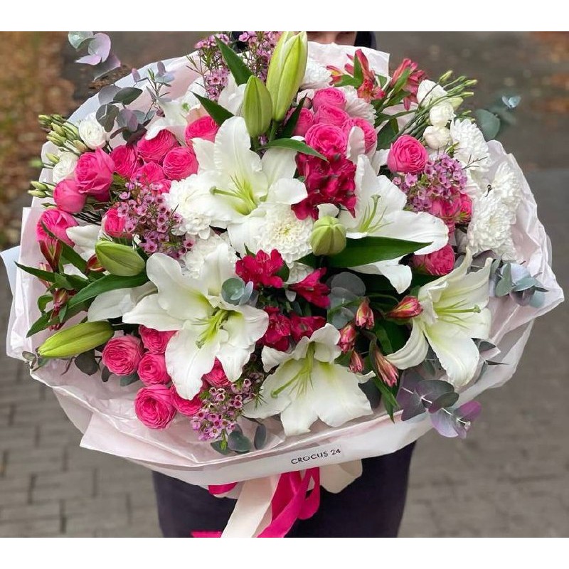 Состав: роза-3шт, кустовая роза-1шт, хризантема-1шт, эустома-1шт, эвкалипт, упаковка