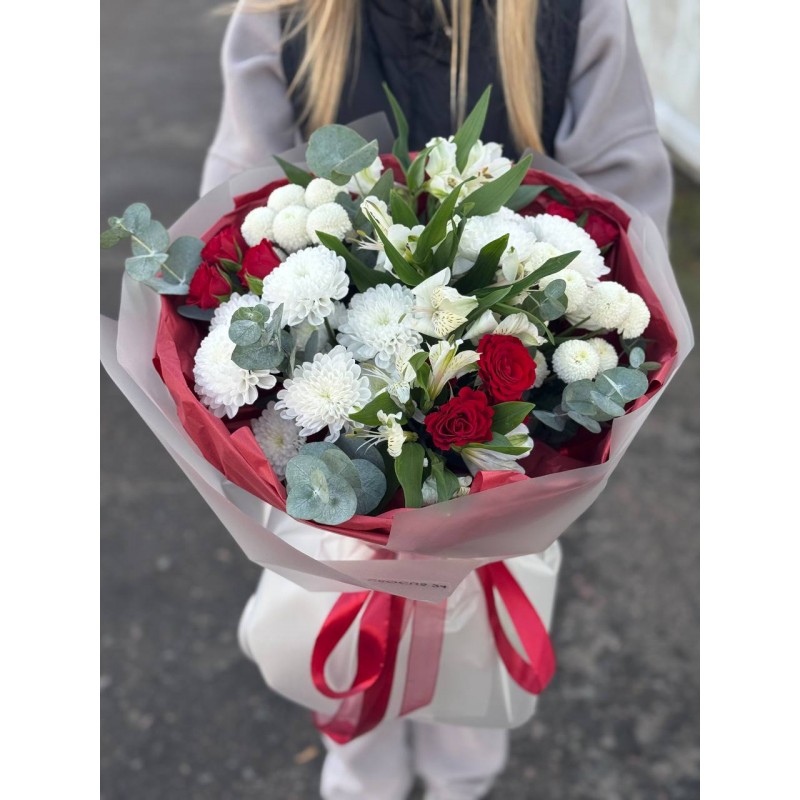Состав: 2 хризантемы, 2 хризантемы ньютон, 3 кустовые розы, 3 альстромерии ,эвкалипт