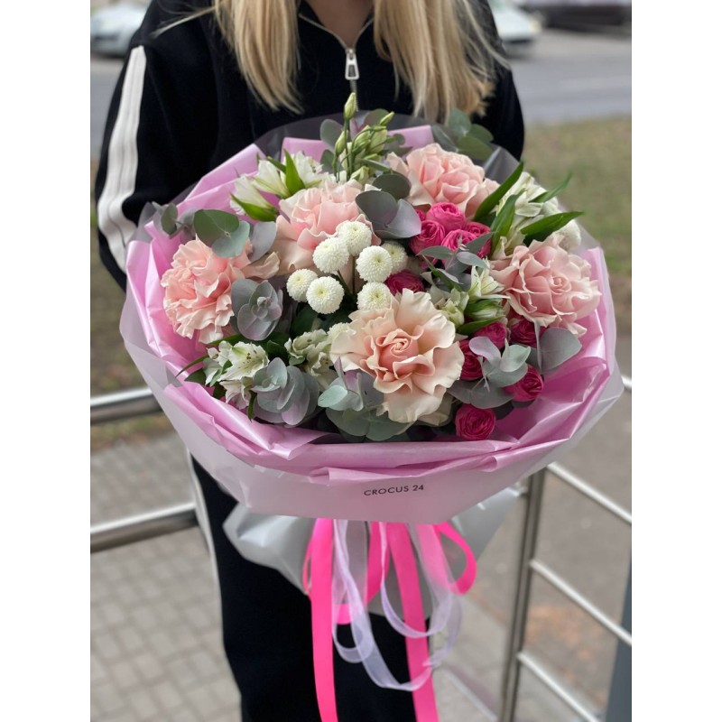 состав: 5 французских роз, 2 кустовые розы, 2 хризантемы "ньютон", 1 эустома , 4 альстромерии, Эвкалипт