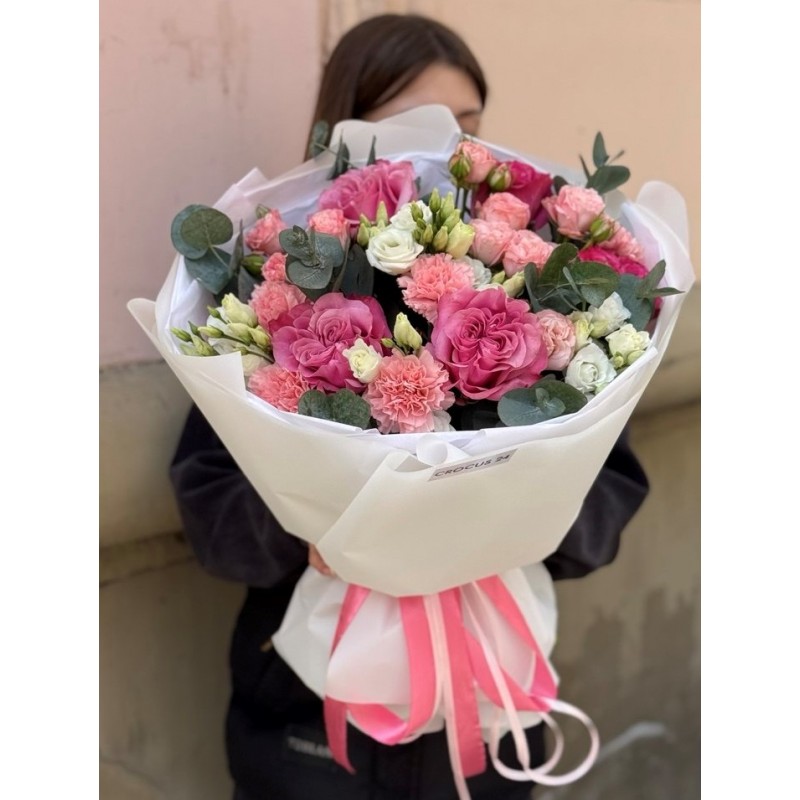 Состав: 5 роз, 2 кустовые розы, 5 гвоздик, 2 эустомы ,эвкалипт