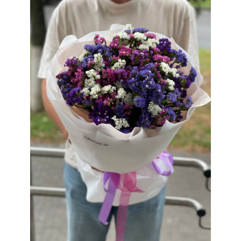 7 эустом, 11 кустовых роз, эвкалипт, упаковка, лента