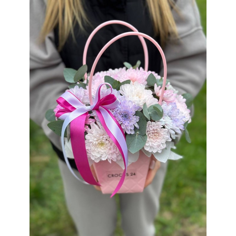 7 эустом, 11 кустовых роз, эвкалипт, упаковка, лента